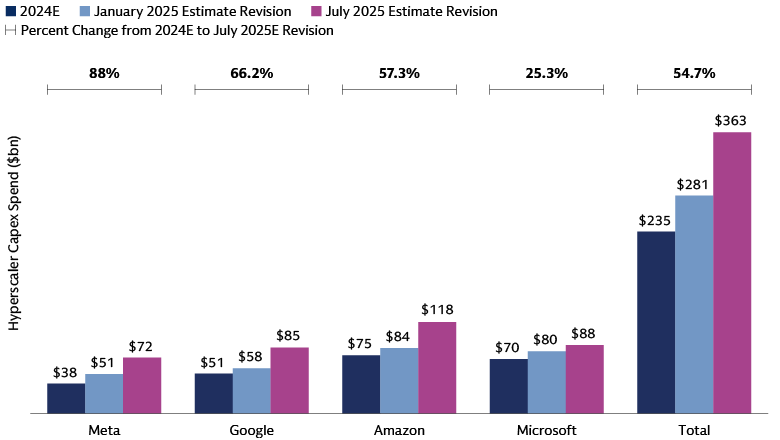 Source: Goldman Sachs Asset Management. Bloomberg, consensus estimates as of July-2025. Note: Microsoft capital expenditure numbers includes capital leases. The economic and market forecasts presented herein are for informational purposes as of the date of this presentation. There can be no assurance the forecasts will be achieved. Please see additional disclosures at the end of this presentation. Any reference to a specific company or security does not constitute a recommendation to buy, sell, hold or directly invest in the company or its securities. There is no guarantee that objectives will be met. Diversification does not protect an investor from market risk and does not ensure a profit.