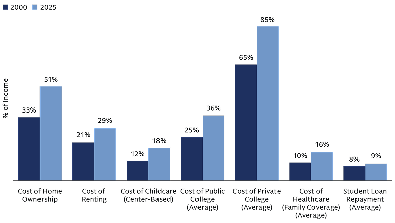 ·  Cost of Renting: 2000: Median gross rent: $602 monthly; 2025:Median gross rent: $1638 monthly: Source: US Census data, Goldman Sachs Asset Management