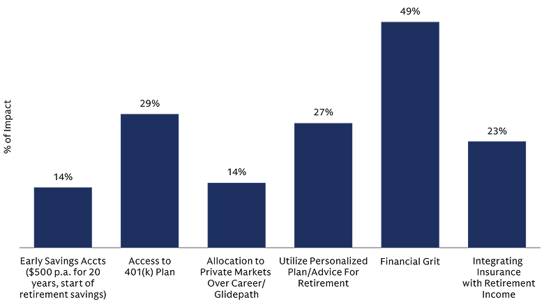 Amid mounting retirement headwinds, there’s a clear ray of hope: thoughtful plan design and policy innovations can measurably improve outcomes. We quantify both the drag from competing priorities and the lift from targeted solutions—earlier and more consistent saving, personalized advice and defaults, integration of protected lifetime income/insurance, and strengthening individual resilience through Financial Grit—that together drive materially better retirement readiness.
