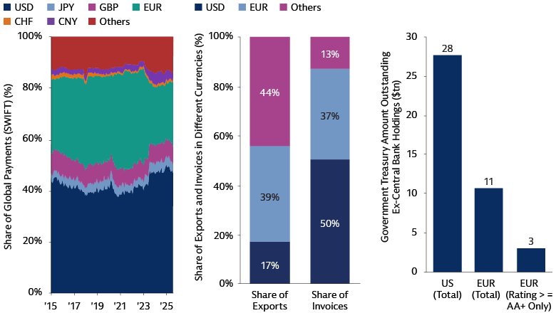 - But despite rising challenges and ongoing discussions around de-dollarization, the US dollar continues to dominate, and the dollar “supremacy” goes well beyond its role as a safe haven and reserve currency. In fact, the dollar plays a central role in the pricing of international goods and financial assets: roughly 50% of international transactions via SWIFT are carried out in dollars, over 40% of goods trade is priced in dollars and US financial markets are among the largest, deepest, most open and most liquid in the world.