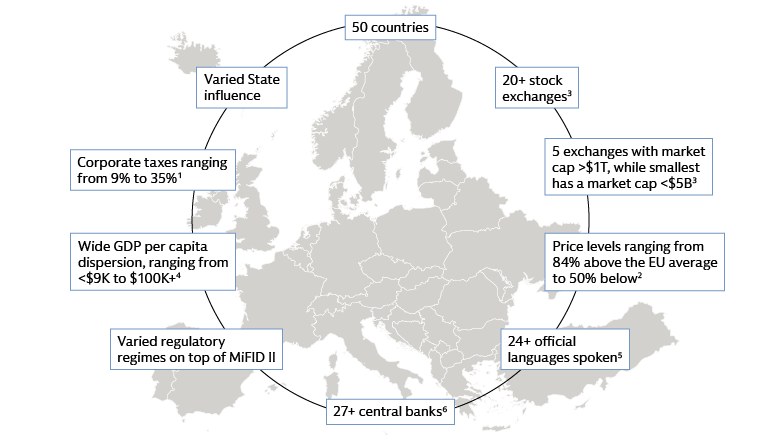 Europe's equity markets fundamentally differs from more homogenous markets like the US, presenting a vast and profoundly heterogeneous landscape. It operates as a complex amalgamation of diverse equity markets, often working both collaboratively and independently. This fragmentation is evident in its over 50 countries, 24 official languages, varied regulatory regimes, and distinct governmental policy priorities. The intricate central banking structure, encompassing the European System of Central Banks (ESCB) with the ECB and national central banks of all 27 EU member states, further highlights this complexity.1 Moreover, significant economic disparities, from wide-ranging GDP per capita and inflation levels to varied corporate tax rates, contribute to the region's unique market dynamics.