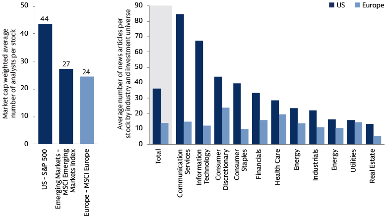 Information in European markets tends to be less abundant, more dispersed, and slower to diffuse than in the US. This is evidenced by lower analyst coverage—a market cap-weighted average of 25 analysts per stock in Europe versus 41 in the US—and fewer news articles per stock (14 average articles tagged per stock in Europe compared to 36 in the US). Analyst coverage in Europe has been declining, with the median quarterly coverage among MSCI Europe stocks falling by 40% since 2015. At a country level, analyst coverage distribution per stock varies widely, and is unrelated to the number of stocks per country. At a sector level, news coverage per stock in Europe is spread across sectors rather than concentrated among select few, like in the US, where tech and communication services capture most of the media’s attention. This dispersion and scarcity of information in Europe creates market inefficiencies, leading valuable information to not be always immediately reflected in asset prices.