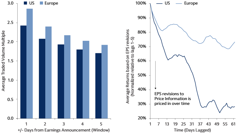 Investors in Europe tend to increase trading volumes around earnings announcements by a higher multiple than their US counterparts, suggesting a greater perceived informational value tied to these announcements, possibly due to lower informational coverage outside formal reports. Meanwhile, the impact of sell-side analyst revisions to earnings per share estimates decays more slowly in Europe. Namely, when the market positively (or negatively) reacts to an increase (or decrease) in sell-side analyst estimated EPS, we see that reaction persists for longer in Europe. For instance, the market's reaction to EPS revisions persists longer in Europe; after 63 days, average daily realized excess returns attributable to EPS revisions remain at 73% of their initial 5-day impact, whereas in the US, efficacy falls to 28% within the same timeframe.3 This indicates a less efficient price discovery mechanism in Europe, offering a temporal advantage for investors employing systematic data gathering to identify and act on information before its alpha potential diminishes. The fragmentation of European capital markets, with numerous exchanges and regulatory differences, contributes to these inefficiencies.
