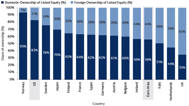 European equity ownership is highly fragmented, with only 56% of European equities owned locally, compared to 83% in the US. This figure varies widely by country, from 93% of domestic ownership in Norway to as low as 35% in the UK. This fragmented ownership can further complicate the price discovery mechanism in Europe compared to more unified markets with higher domestic ownership.