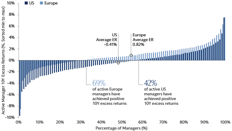 Source: MSCI, Goldman Sachs Asset Management and eVestment. As of June 30, 2025. Data retrieved on August 19, 2025. Only Active managers considered. Returns are based on USD. Europe and US represented by the All Europe Equity and US Large Cap Equity universes. Benchmarks are the manager preferred benchmark, and when Null, S&P 500 and MSCI Europe -ND respectively.