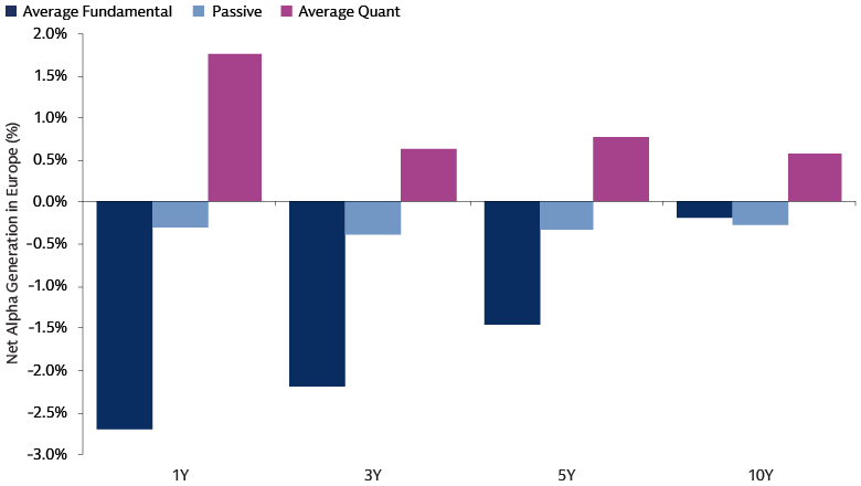 Historically, quantitative strategies have proven highly successful in European equities, as quant managers consistently outperform passive and fundamental approaches across various time horizons,5 thereby underscoring the efficacy of these methods in such a unique market.