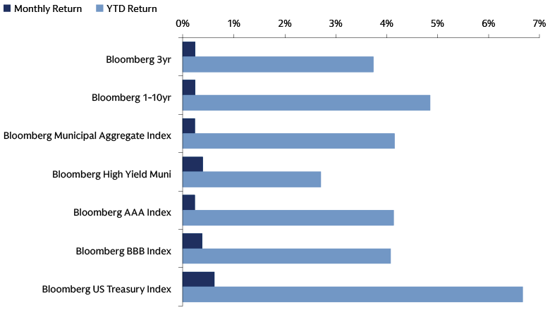 The Bloomberg Muni Index returned +0.23% in November, while the Bloomberg Muni High Yield Index increased by +0.39%. All credit ratings (AAA–BBB) saw positive performance within investment grade munis.