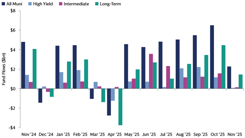 November continued the trend into investment grade munis, but was spread amongst various durations across the curve. YTD fund inflows have totaled $48 billion, with most of those inflows to ETFs and investment grade munis.