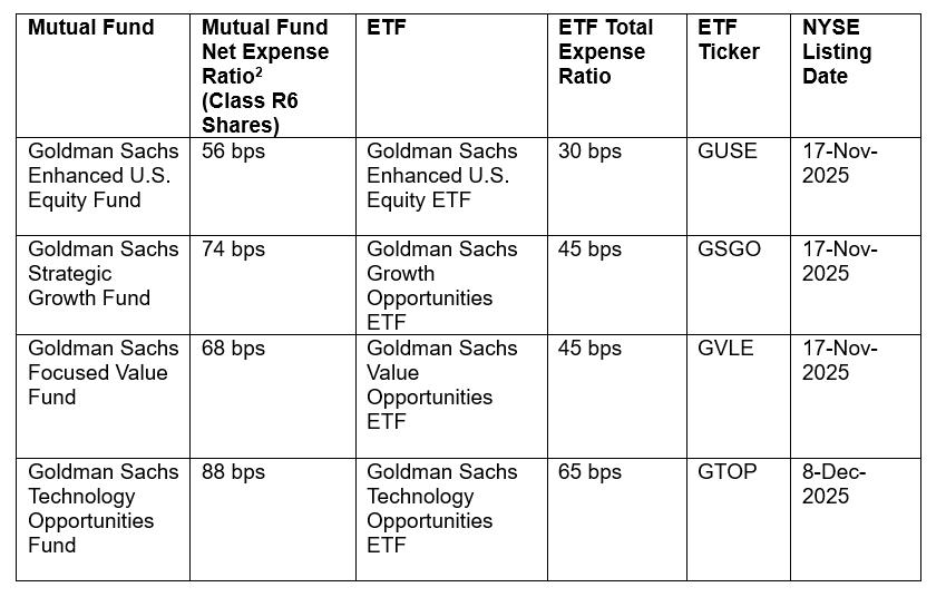 NEW YORK – December 8, 2025 – Goldman Sachs Asset Management today announced that it has successfully completed the conversion of four mutual funds (each, a “fund” and together, the “funds”) to exchange-traded funds (ETFs). Converting the funds, which had approximately $1.5 billion in combined Assets Under Supervision (AUS)1, into actively managed ETFs provides shareholders with the potential for increased tax efficiency, additional trading flexibility, increased transparency, and lower costs, as the expense ratio of each fund was reduced upon conversion.