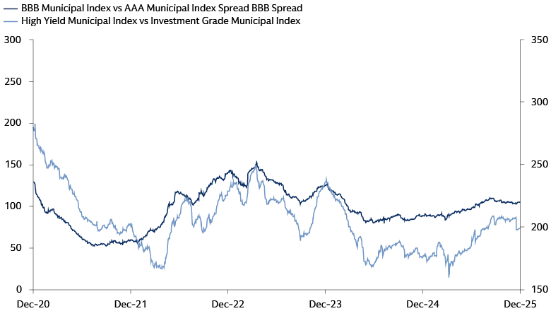 The Bloomberg Municipal Aggregate Index returned +0.09% in December and +1.56% for Q4, while the Bloomberg Muni High Yield Index returned -0.24% and +1.15%, respectively. The IG and HY muni indices returned +4.25% and +2.46% respectively in 2025.