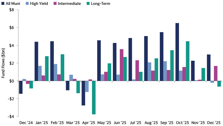 Muni fund flows totaled $3 billion for December. 2025 fund flows totaled $51 billion ($17 billion mutual funds and $34 billion ETFs). Investment grade quality munis saw strong flows at the intermediate and long-end of the curve.