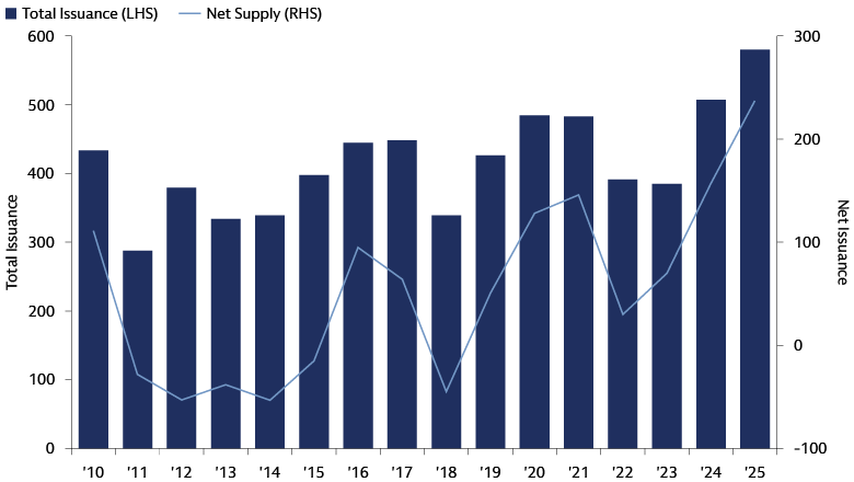 2025 full-year municipal issuance totaled $580 billion ($547 billion tax-exempt and $33 billion taxable). This is up 14% versus 2024 and a record year for total new issuance.