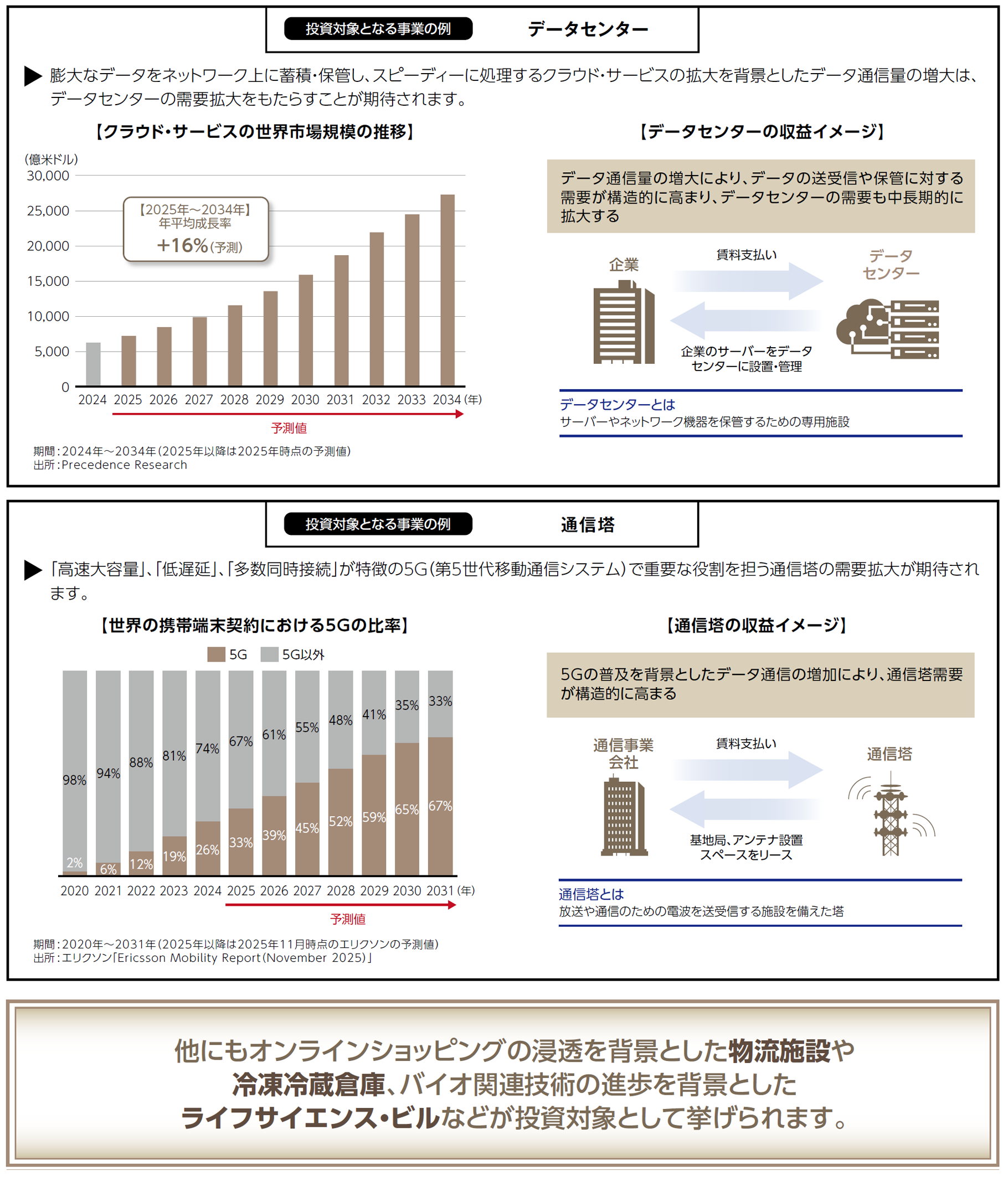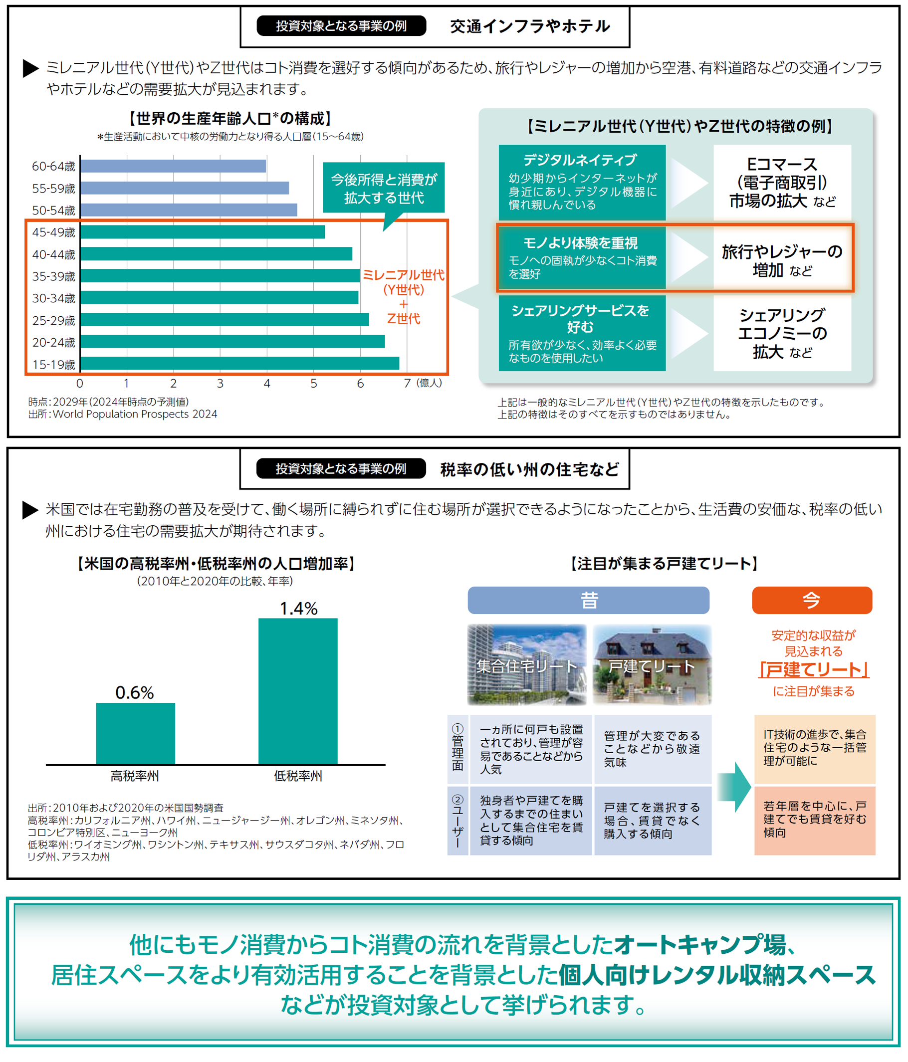 上記は経済や市場等の過去のデータおよび一時点における予測値であり、将来の動向を示唆あるいは保証するものではありません。経済、市場等に関する予測は資料作成時点のものであり、情報提供を目的とするものです。予測値の達成を保証するものではありません。投資対象のイメージはあくまで例であり、投資対象すべてを表すものではありません。写真・イラストはイメージです。