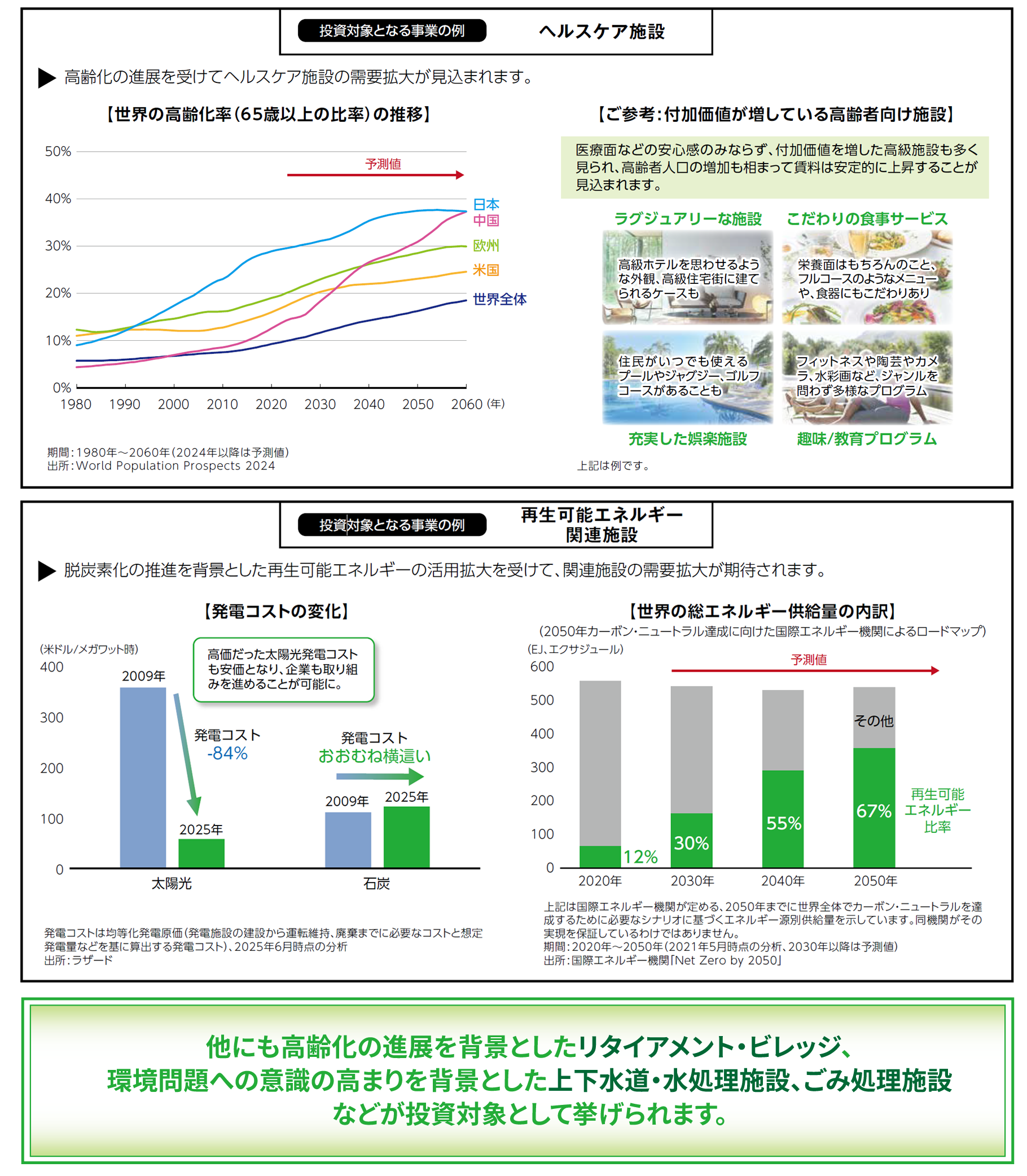 主要先進国や中国を中心とした高齢化などの構造的な問題への対策となる施設や、持続可能な社会を実現するために不可欠な施設の需要が拡大することが見込まれます。