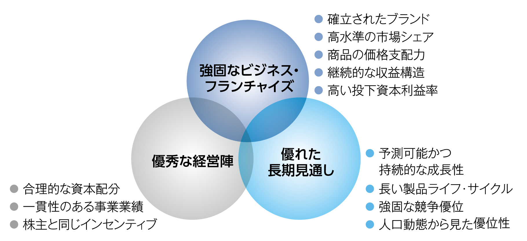 上記は、持続可能かつ継続的な収益拡大が見込める企業についての一般的な特徴をまとめたものであり、必ずしもすべての組入銘柄にあてはまるものではありません。