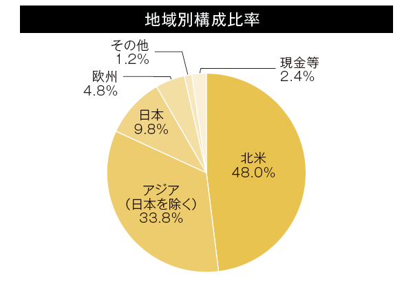 上記構成比率は投資対象ファンドの純資産総額に対する比率です。上記の比率は、小数点以下第二位を四捨五入しているため、合計が100%にならない場合があります。